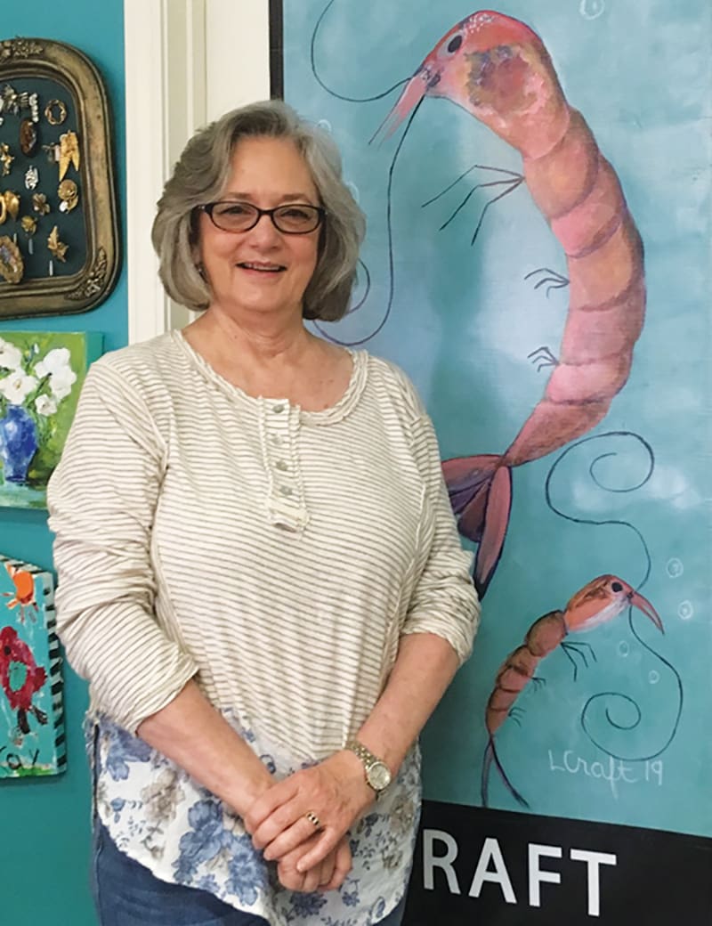 For her banner art, Lynn painted a fun picture of whimsical shrimp. She likes them because they remind her of Destin. She was fascinated by shrimp as a child and used to watch them swim on the water surface – before catching them in a seine net. Lynn also remembers seeing Johnny Sexton sell shrimp out of the back of his truck long before there was a Sexton’s Seafood Market.