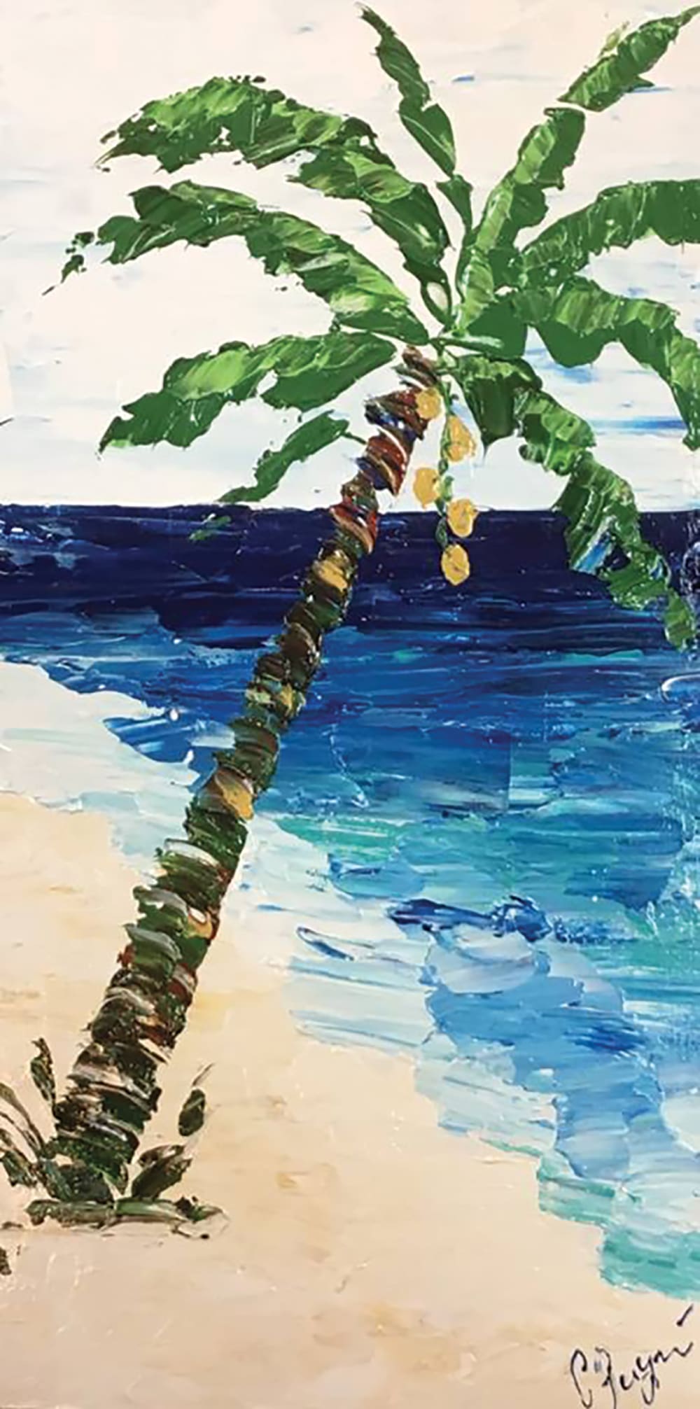 Claire has been an artist all her life but has only begun selling her work in the last five years. She was mentored locally by artist Don Sawyer who encouraged her to develop her painting skills. Claire’s favorite styles of art are abstract and impressionism. She prefers using a pallet knife over a brush — but can do either. Her work can be seen at Kahn’s Furniture and Coastal Decor and Emerald Coast Gallery next to McGuire’s. Claire’s stylized painting of a palm tree on a beach can be seen in front of Destin Water Users. Thank you Claire for your love of painting and your skill.