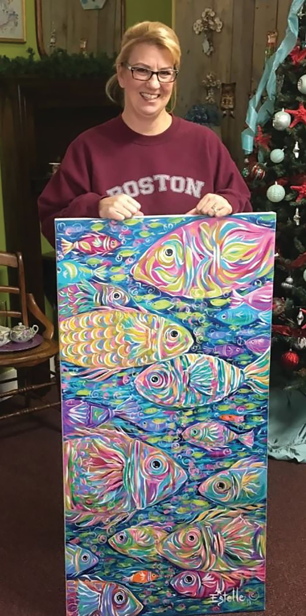 Estelle Grengs grew up in Dover, New Hampshire, and has been an artist all her life. She loved her art classes in high school and was one of those kids that preferred art supplies over Barbie dolls. At 19 she married Matthew Grengs who became a career NCO in the Air Force. While Matt served his country, Estelle and her two children got to see the world moving 9 times and finally settling in Freeport. During this time Estelle continued to develop her artistic style and transitioned from a self-taught folk artist to whimsical impressionism. She sees her artwork as continuing to evolve and is happy with the direction it has gone. Her depictions of fish, boats and waves are all fantastical and tend to prod the imagination. Although succeeding as an artist, she has not given up her day job. She works at Eglin AFB as a civil servant teaching others how to teach children. She also runs an art camp for military children.
