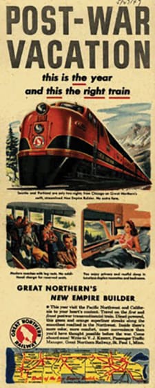 By 1929 train travel had decreased by 18% due to an increase in automobile ownership. Railroad travel dropped even more during the Depression, but gained back ground after the 1934 debut of the Burlington Chicago, and Quincy’s streamlined, diesel-powered Zepher and the Union Pacific’s gasoline-powered M-10,000. Then World War II broke out in Europe in 1939 and the public was encouraged to delay personal travel unless absolutely necessary.