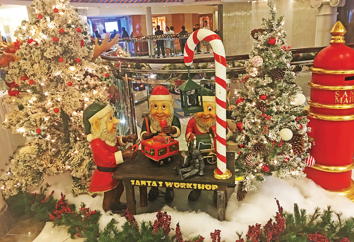 It’s well known that cruise ships are always decked out in their finest and that goes for Christmas décor as well. From baby Jesus lying in a manger to Santa’s workshop to winter wonderland or even winter with palm trees, a cruise ship’s Christmas décor rarely disappoints.
