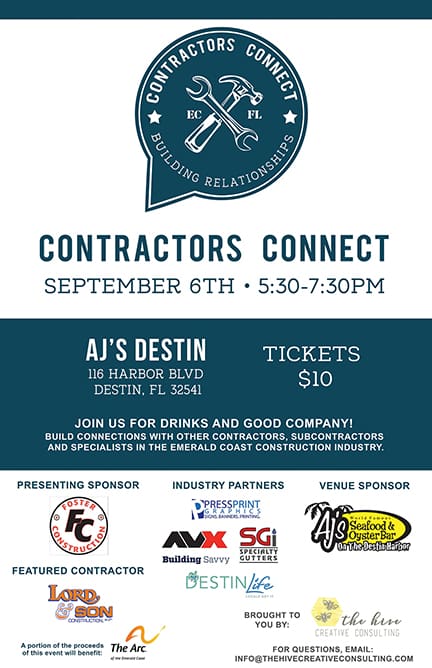 At the Sept. 6 meetup, which is sponsored by Foster & Company, LLC, contractors from along the Emerald Coast can join together from 5:30 to 7:30 p.m. at AJ’s on the Destin Harbor to chat with Lord & Son about its work in the community and support the Arc of the Emerald Coast while celebrating the year anniversary of Contractors Connect.