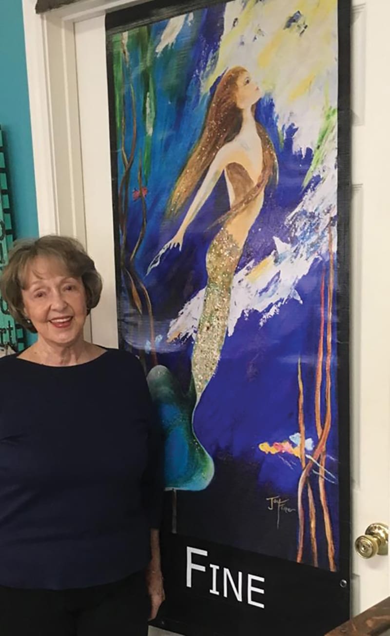Joy Fine has lived and created art in Destin for the last 24 years. She was raised and educated in Oklahoma and moved here after a career in retail in Dallas. She learned art from her mother who was an accomplished china painter. Her preferred art medium is watercolor and loves painting coastal and tropical scenes. Her work can be found in Emerald Coast Gallery next to McGuire’s and at The Destin Pearl in the Commons where she works on Mondays. “Joy’s art is colorful, fun, and spiritual and I love having her art in our gallery,” says Jennifer Viaene at the Emerald Coast Gallery. Joy also teaches art and prefers the one on one approach. The mermaid she painted for our banner is a classical image of a mermaid swimming toward the light in the ocean. And isn’t that what we should all be searching for – the Light. Thank you, Joy, for your painting.