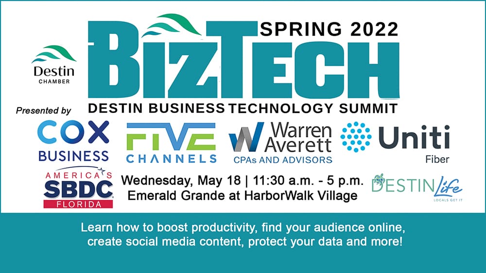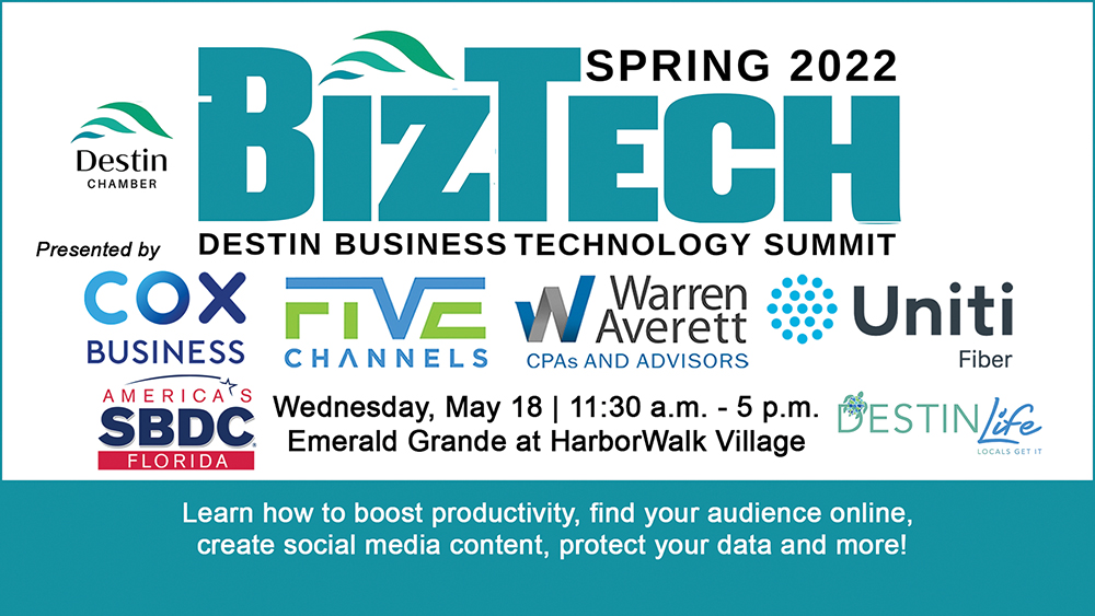 To register, visit www.destinchamber.com/events/details/biztech-destin-business-technology-summit-presented-by-cox-five-channels-uniti-fiber-and-warren-averett-48872.