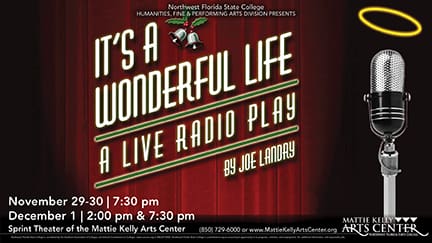 Northwest Florida State College (NWFSC) is proud to present Joe Landry’s It’s a Wonderful Life: A Radio Play. Set in a glamourous radio production studio, performers are warming up and preparing to present the live radio show of the beloved Christmas story. This live dramatic and musical performance will take audiences back in time to the 1940’s, when radio shows brought families together for story time and good, old-fashioned fun. It’s a Wonderful Life unfolds with beautiful carols of the season sung by student vocal groups, Madrigal Singers and Belle Voci, and features performances by student actors. It’s a Wonderful Life recalls the story of George Bailey’s Christmas transformation. Audiences will fall in love all over again with George and Mary, and laugh as Clarence finally earns his wings. This holiday classic is bound to give wings to all who attend, and the spirit of joy will soar throughout the holidays.