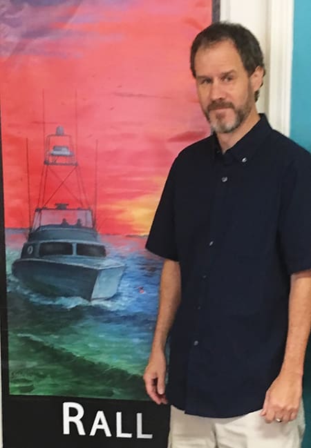 For his banner art, Mitch painted a fishing boat returning to the docks after a day of fishing. The boat is finely detailed with a beautifully curved hull, fishing tower, and outriggers. It cuts through the waves with a brilliant sunset behind it. His amazing use of colors gives this painting depth and movement. Most people who live here have seen these sunsets — and they are as spectacular as Mitch’s painting.