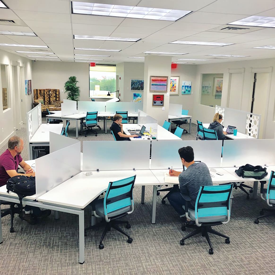 Private Offices – Professionals who will establish a longer commitment may select a private office or executive suite in a coworking community. This option provides users with a dedicated, private space for one or more persons, which can usually be rented month-to-month without signing a long-term lease commitment. A few differences between coworking communities and traditional office real estate include no credit check requirement, no additional utility costs and no long-term lease commitment. Coworking communities help your business stay agile, giving you flexibility to add on and remove products as your team grows or right-sizes.