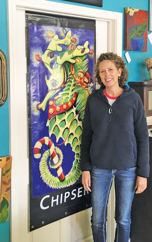 Christine Ramey’s playful Children on the Beach was a multimedia creation showing children with Santa hats leaping into the air on a beach. This colorful painting was Christine’s second artwork for our Banner Project. Christine owns a boutique gallery named Art & Soul 30A in Walton County where she sells her paintings, as well as other fun things.