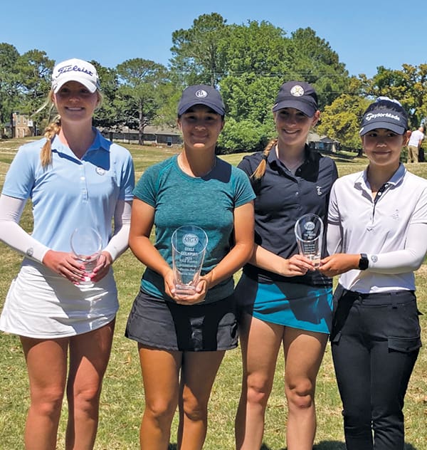 On Sunday, April 13, trophies were presented to the top men and women golfers. In first place, from Jacksonville, Fla., was Ethan Gossman with a two-day score of 149. Ethan won in a playoff with Charlie Hipp of St. Johns, Fla. Tied for 3rd place was Hugh Michael Hollingsworth from Milton, Ga., Henry Hurley from Atlanta, Ga., and Nathan Peji from Dunwoody, Ga., with a score of 153.