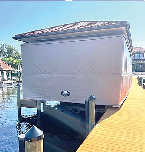 A: Well, it’s a custom-made boat cover system. It’s measured for the boat, lift and dock so that there’s a perfect fit with all components. It’s raised and lowered electronically.