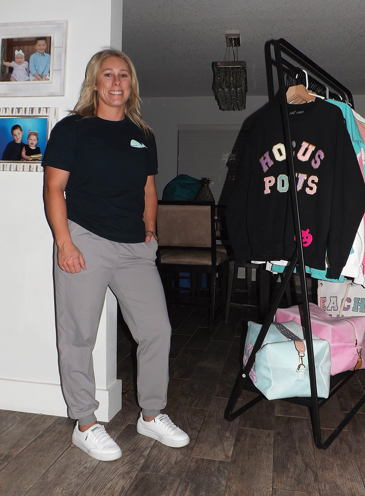 The Southern Illinois University graduate was a CrossFit instructor, helping clients to develop confidence and body awareness while performing movements that are natural for their bodies. But the idea of creating and selling fun, often quirky, clothing was dormant in the back of her mind.