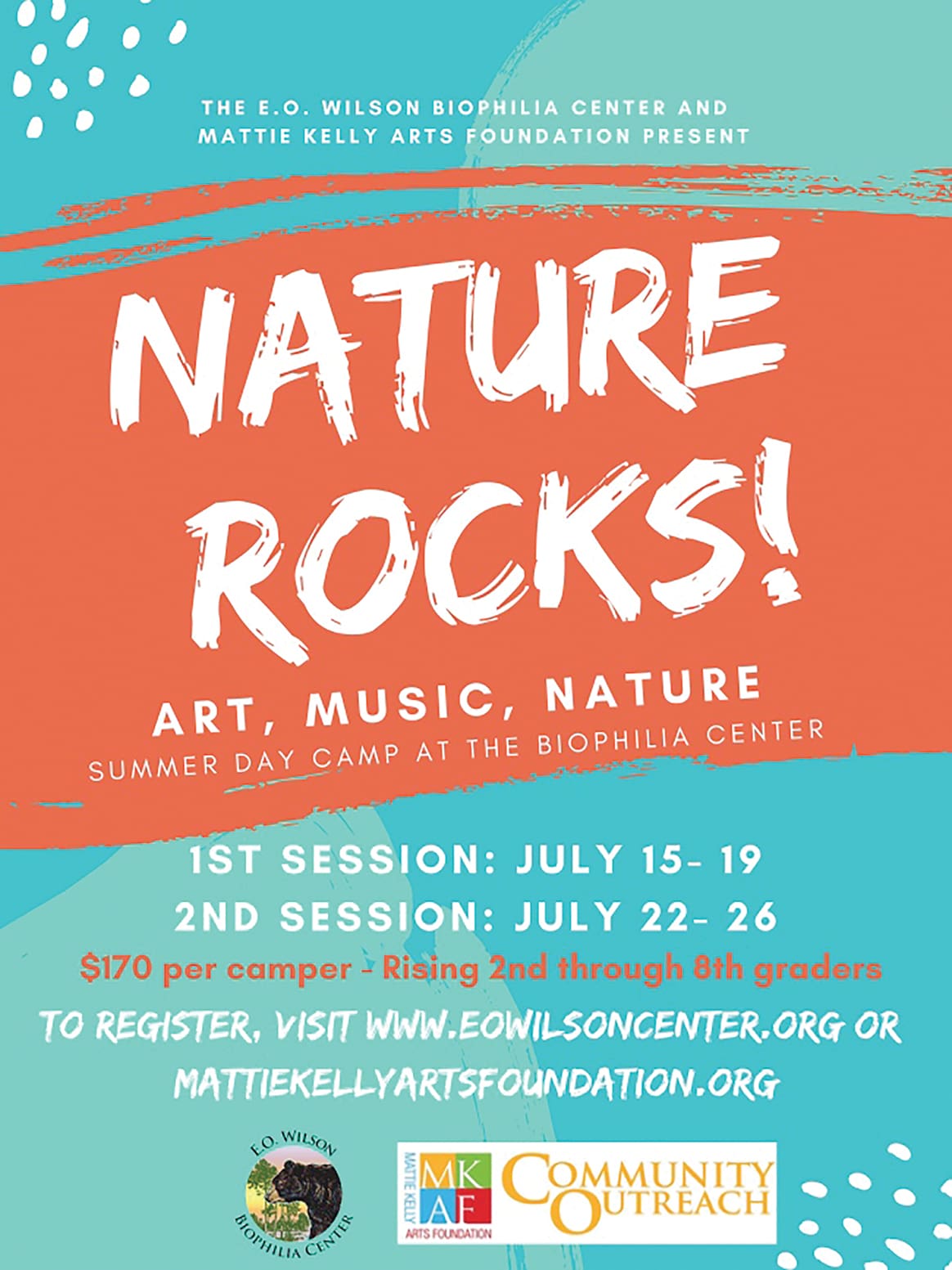 Back by popular demand, Mattie Kelly Arts Foundation and the E.O. Wilson Biophilia Center join forces, once again, to really rock the summer! For grades 2nd through 8th, choose from two week-long summer camps exploring theatre, music, and nature, all while exploring the dynamic and engaging E. O. Wilson Biophilia Center!