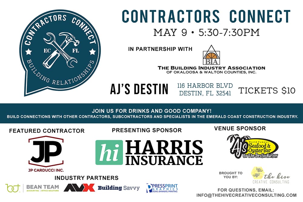 Boost your sponsorship opportunities, promote and expose your services to contractors while benefiting homeless children in our area! Contractors Connect, the premier networking event for local contractors, will host its next meetup on Thursday, May 9 from 5:30 to 7:30 p.m. at AJ’s on the Destin Harbor. Presented in partnership with the Building Industry Association of Okaloosa & Walton Counties, a professional organization of builders, developers, and associates, it’s $10 to attend and includes one free draft beer, light appetizers, and the opportunity to win in multiple giveaways.
