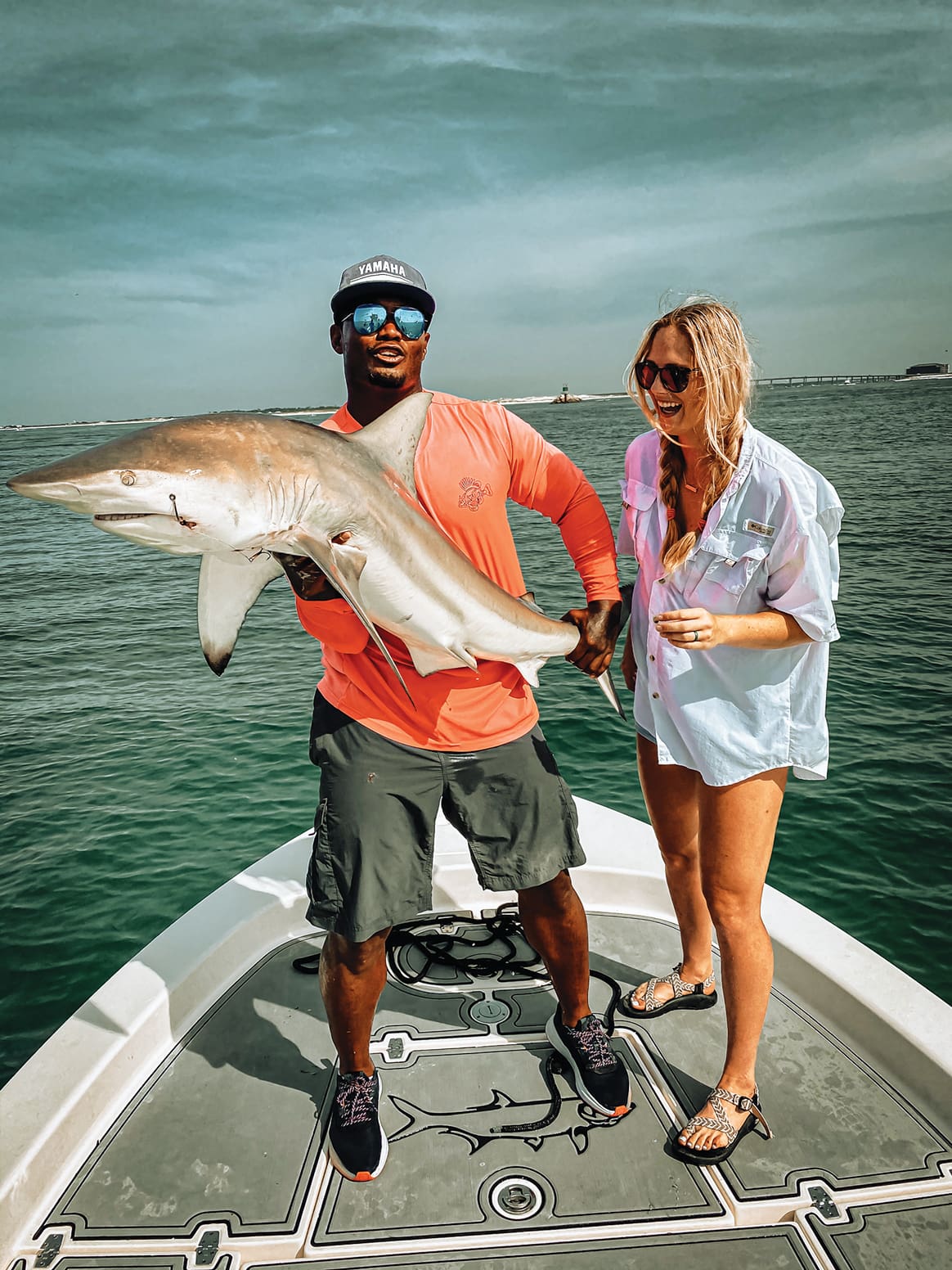 Mako Sharks can also be found in our Emerald Coast waters and are known to be the fastest sharks on Earth – reaching speeds of up to 20 m.p.h. Their body is cylindrical, and females usually grow to be bigger and stronger than males, between 10-12 feet long. Interestingly enough, 92% of a Mako’s diet is Bluefish, and it will consume 3% of its body weight every single day.