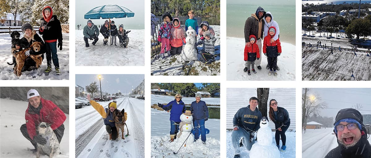 The Emerald Coast transformed into a stunning winter wonderland, and we didn’t waste a second enjoying it. Families built snowmen topped with seashells, seaweed, palm branches and beach hats, blending our beachy, coastal charm with a picture-perfect winter scene right off a Hallmark Christmas card. Snowball fights broke out, snow angels filled the yards, kids and kids-at-heart “snow surfed” on anything they could find and we all soaked in a moment we might not see again for years. Even our sugar-white sand was overlaid with glistening snow!