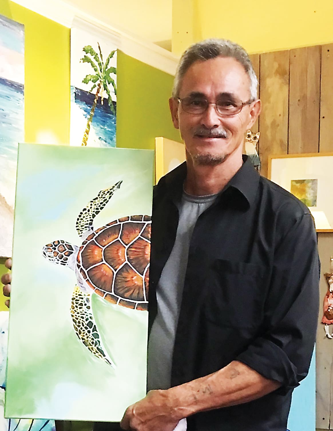 James Mulling has lived in the Destin area for the last 25 years and is known as a lay preacher, postman, house painter, musician, song writer and author of two books. He can now add artist to that list. His painting of a sea turtle swimming in the ocean is very realistic. This is a wonderful painting. But, surprisingly, James didn’t know he had an artistic eye until his wife, Kat, gave him art supplies as a gift. After Kat left on an extended trip, he started painting. He has painted something every day since. He painted his turtle on day 73. Sometimes finding your talent is like a baby bird leaving its nest. It doesn’t know it can fly — but then it does. That is James!