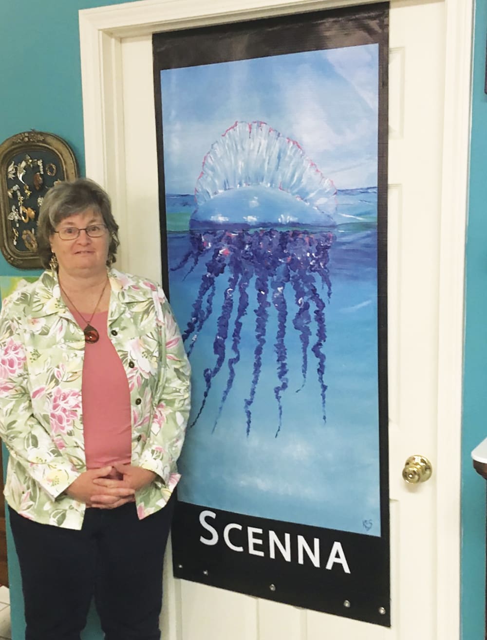For her banner, Kelly chose to paint a very realistic Portuguese Man-of-War. I love the colors of this unusual animal but have always been nervous when I see one. I have learned some interesting facts: They are not jelly fish — they are actually a colony of four individual organisms called polyps — they are painful but ordinarily not fatal to humans. I feel like an old dog learning new tricks!