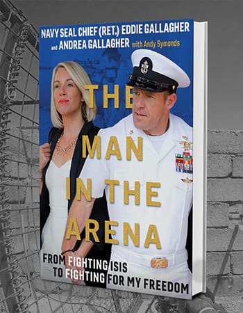 They have also written a newly released book, The Man in the Arena. The book features never-before-revealed details of Eddie’s experience fighting for his freedom. He holds nothing back when explaining how and why he feels several malcontents in his SEAL platoon conspired to frame him for war crimes. Eddie also explains exactly what happened that May afternoon in Iraq when after a fierce battle with ISIS, a terrorist was brought to the SEAL compound for medical aid and died in their care. Andrea wrote several chapters from her perspective, comparing Eddie to the Old Testament’s Joseph, who was betrayed by his brothers and sold into slavery in Egypt.