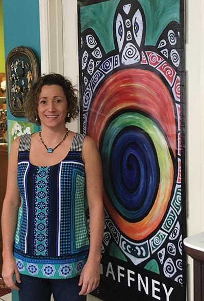Julie prefers using acrylics when she paints. She says that painting is therapeutic for her and she works on two or three paintings at a time. Her paintings are all characterized by bright colors. Julie’s banner art is a good example. Her stylized turtle is a rainbow of color. It pleases her when a good combination of colors works in one of her paintings — and it certainly works on her banner.