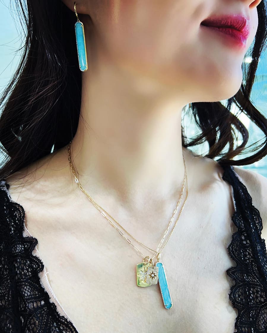 Stop by the shop and try to decide which shape suits you best. Owner Ashleigh Woolly carries one-of-a-kind pieces with coastal colors perfect for Destin such as earrings with amazonite and diamonds, a matching necklace or diamond “dog tag” charm necklace.